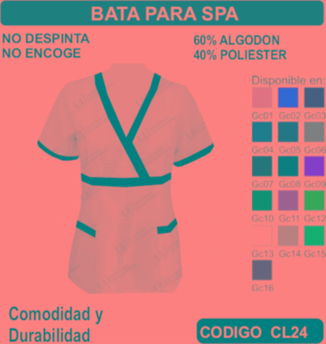 La Bata para Spa se fabrica en Tela de primera calidad; La Bata para Spa no encoge y tiene costuras reforzadas; La Bata para Spa está fabricado para uso continuo; La Bata para Spa está disponible en todas las tallas; La Bata para Spa se puede fabricar en cualquier color que esté disponible dentro de nuestro catálogo de telas. La Bata para Spa se envía a cualquier parte de la República Mexicana. En todos los uniformes que vendemos está garantizada su inversión ya que incluye un seguro por robo o extravió. El pedido mínimo es de 15 uniformes. Los precios incluyen: Uniforme (producto), Bordado o estampado, Planchado, Empaquetado individual, Envió a domicilio, Seguro por Robo o Extravió. El TIEMPO DE ENTREGA es de la siguiente manera: De 15 a 50 uniformes 1 semana, de 51 a 300 uniformes 2 semanas, de 301 a 1000 uniformes 3 semanas, de 1001 a 2000 uniformes 4 semanas, para pedidos mayores favor de verificar el tiempo de entrega antes de hacer su pedido. Pedidos Urgentes y tallas XXL –XXL tienen un costo adicional. El tiempo de entrega Aplica sumando el total de su pedido.