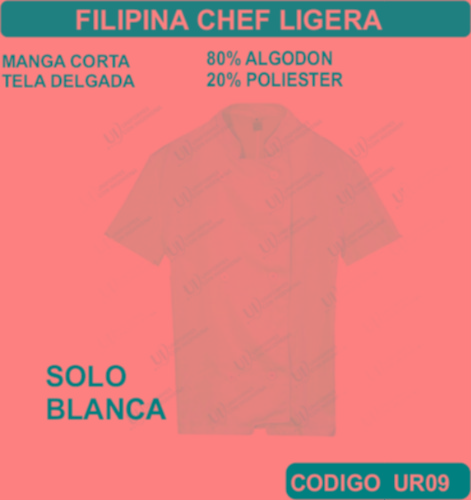 La Filipina para Chef se fabrica en Tela de primera calidad; La Filipina para Chef no encoge y tiene costuras reforzadas; La Filipina para Chef está fabricada para uso continuo; La Filipina para Chef está disponible en todas las tallas; La Filipina para Chef se puede fabricar en cualquier color que esté disponible dentro de nuestro catálogo de telas. La Filipina para Chef se envía a cualquier parte de la República Mexicana. En todos los uniformes que vendemos está garantizada su inversión ya que incluye un seguro por robo o extravió. El pedido mínimo es de 15 uniformes. Los precios incluyen: Uniforme (producto), Bordado o estampado, Planchado, Empaquetado individual, Envió a domicilio, Seguro por Robo o Extravió. El TIEMPO DE ENTREGA es de la siguiente manera: De 15 a 50 uniformes 1 semana, de 51 a 300 uniformes 2 semanas, de 301 a 1000 uniformes 3 semanas, de 1001 a 2000 uniformes 4 semanas, para pedidos mayores favor de verificar el tiempo de entrega antes de hacer su pedido. Pedidos Urgentes y tallas XXL –XXL tienen un costo adicional. El tiempo de entrega Aplica sumando el total de su pedido.