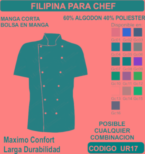 La Filipina para Chef se fabrica en Tela de primera calidad; La Filipina para Chef no encoge y tiene costuras reforzadas; La Filipina para Chef está fabricada para uso continuo; La Filipina para Chef está disponible en todas las tallas; La Filipina para Chef se puede fabricar en cualquier color que esté disponible dentro de nuestro catálogo de telas. La Filipina para Chef se envía a cualquier parte de la República Mexicana. En todos los uniformes que vendemos está garantizada su inversión ya que incluye un seguro por robo o extravió. El pedido mínimo es de 15 uniformes. Los precios incluyen: Uniforme (producto), Bordado o estampado, Planchado, Empaquetado individual, Envió a domicilio, Seguro por Robo o Extravió. El TIEMPO DE ENTREGA es de la siguiente manera: De 15 a 50 uniformes 1 semana, de 51 a 300 uniformes 2 semanas, de 301 a 1000 uniformes 3 semanas, de 1001 a 2000 uniformes 4 semanas, para pedidos mayores favor de verificar el tiempo de entrega antes de hacer su pedido. Pedidos Urgentes y tallas XXL –XXL tienen un costo adicional. El tiempo de entrega Aplica sumando el total de su pedido.
