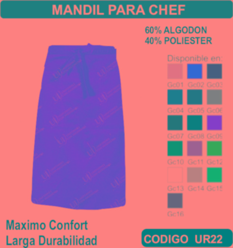 El Mandil para Chef se fabrica en Tela de primera calidad; El Mandil para Chef no encoge y tiene costuras reforzadas; El Mandil para Chef está fabricada para uso continuo; El Mandil para Chef está disponible en todas las tallas; El Mandil para Chef se puede fabricar en cualquier color que esté disponible dentro de nuestro catálogo de telas. El Mandil para Chef se envía a cualquier parte de la República Mexicana. En todos los uniformes que vendemos está garantizada su inversión ya que incluye un seguro por robo o extravió. El pedido mínimo es de 15 uniformes. Los precios incluyen: Uniforme (producto), Bordado o estampado, Planchado, Empaquetado individual, Envió a domicilio, Seguro por Robo o Extravió. El TIEMPO DE ENTREGA es de la siguiente manera: De 15 a 50 uniformes 1 semana, de 51 a 300 uniformes 2 semanas, de 301 a 1000 uniformes 3 semanas, de 1001 a 2000 uniformes 4 semanas, para pedidos mayores favor de verificar el tiempo de entrega antes de hacer su pedido. Pedidos Urgentes y tallas XXL –XXL tienen un costo adicional. El tiempo de entrega Aplica sumando el total de su pedido.