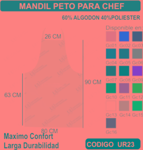 El Mandil para Chef se fabrica en Tela de primera calidad; El Mandil para Chef no encoge y tiene costuras reforzadas; El Mandil para Chef está fabricada para uso continuo; El Mandil para Chef está disponible en todas las tallas; El Mandil para Chef se puede fabricar en cualquier color que esté disponible dentro de nuestro catálogo de telas. El Mandil para Chef se envía a cualquier parte de la República Mexicana. En todos los uniformes que vendemos está garantizada su inversión ya que incluye un seguro por robo o extravió. El pedido mínimo es de 15 uniformes. Los precios incluyen: Uniforme (producto), Bordado o estampado, Planchado, Empaquetado individual, Envió a domicilio, Seguro por Robo o Extravió. El TIEMPO DE ENTREGA es de la siguiente manera: De 15 a 50 uniformes 1 semana, de 51 a 300 uniformes 2 semanas, de 301 a 1000 uniformes 3 semanas, de 1001 a 2000 uniformes 4 semanas, para pedidos mayores favor de verificar el tiempo de entrega antes de hacer su pedido. Pedidos Urgentes y tallas XXL –XXL tienen un costo adicional. El tiempo de entrega Aplica sumando el total de su pedido.