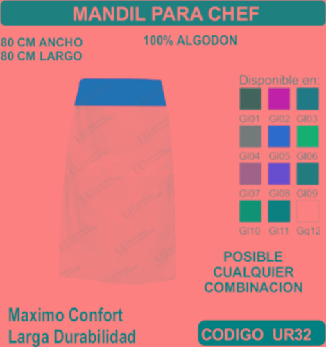 El Mandil para Chef se fabrica en Tela de primera calidad; El Mandil para Chef no encoge y tiene costuras reforzadas; El Mandil para Chef está fabricada para uso continuo; El Mandil para Chef está disponible en todas las tallas; El Mandil para Chef se puede fabricar en cualquier color que esté disponible dentro de nuestro catálogo de telas. El Mandil para Chef se envía a cualquier parte de la República Mexicana. En todos los uniformes que vendemos está garantizada su inversión ya que incluye un seguro por robo o extravió. El pedido mínimo es de 15 uniformes. Los precios incluyen: Uniforme (producto), Bordado o estampado, Planchado, Empaquetado individual, Envió a domicilio, Seguro por Robo o Extravió. El TIEMPO DE ENTREGA es de la siguiente manera: De 15 a 50 uniformes 1 semana, de 51 a 300 uniformes 2 semanas, de 301 a 1000 uniformes 3 semanas, de 1001 a 2000 uniformes 4 semanas, para pedidos mayores favor de verificar el tiempo de entrega antes de hacer su pedido. Pedidos Urgentes y tallas XXL –XXL tienen un costo adicional. El tiempo de entrega Aplica sumando el total de su pedido.