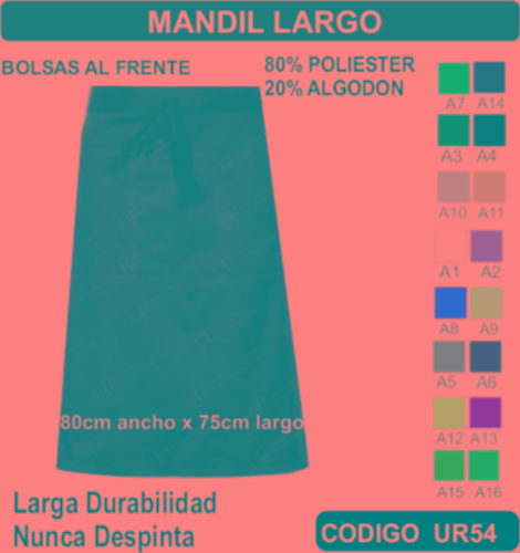 El Mandil para Mesero se fabrica en Tela de primera calidad; El Mandil para Mesero no encoge y tiene costuras reforzadas; El Mandil para Mesero está fabricada para uso continuo; El Mandil para Mesero está disponible en todas las tallas; El Mandil para Mesero se puede fabricar en cualquier color que esté disponible dentro de nuestro catálogo de telas. El Mandil para Mesero se envía a cualquier parte de la República Mexicana. En todos los uniformes que vendemos está garantizada su inversión ya que incluye un seguro por robo o extravió. El pedido mínimo es de 15 uniformes.