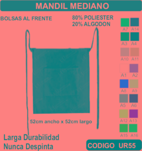 El Mandil para Mesero se fabrica en Tela de primera calidad; El Mandil para Mesero no encoge y tiene costuras reforzadas; El Mandil para Mesero está fabricada para uso continuo; El Mandil para Mesero está disponible en todas las tallas; El Mandil para Mesero se puede fabricar en cualquier color que esté disponible dentro de nuestro catálogo de telas. El Mandil para Mesero se envía a cualquier parte de la República Mexicana. En todos los uniformes que vendemos está garantizada su inversión ya que incluye un seguro por robo o extravió. El pedido mínimo es de 15 uniformes. Los precios incluyen: Uniforme (producto), Bordado o estampado, Planchado, Empaquetado individual, Envió a domicilio, Seguro por Robo o Extravió. El TIEMPO DE ENTREGA es de la siguiente manera: De 15 a 50 uniformes 1 semana, de 51 a 300 uniformes 2 semanas, de 301 a 1000 uniformes 3 semanas, de 1001 a 2000 uniformes 4 semanas, para pedidos mayores favor de verificar el tiempo de entrega antes de hacer su pedido. Pedidos Urgentes y tallas XXL –XXL tienen un costo adicional. El tiempo de entrega Aplica sumando el total de su pedido.