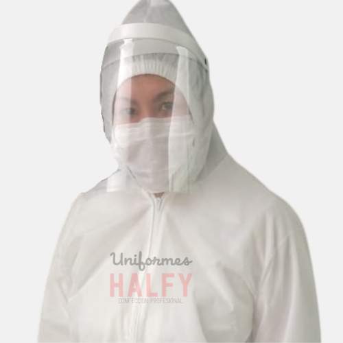 Overol desechable fabricado con tela no tejida anti fluido SMS de 60 gms , unitalla 40-42 cierre al frente con resorte en puños, mangas y gorro , solo lleva costuras en hombro entrepierna y mangas lo demás es una sola pieza .