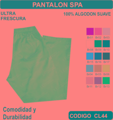 El pantalon para spa se fabrica en Tela de primera calidad; El pantalon para spa no encoge y tiene costuras reforzadas; El pantalon para spa está fabricado para uso continuo; El pantalon para spa está disponible en todas las tallas; El pantalon para spa se puede fabricar en cualquier color que esté disponible dentro de nuestro catálogo de telas. El pantalon para spa se envía a cualquier parte de la República Mexicana. En todos los uniformes que vendemos está garantizada su inversión ya que incluye un seguro por robo o extravió. El pedido mínimo es de 15 uniformes.