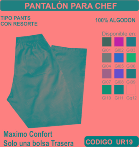 El Pantalon para Chef se fabrica en Tela de primera calidad; El Pantalon para Chef no encoge y tiene costuras reforzadas; El Pantalon para Chef está fabricada para uso continuo; El Pantalon para Chef está disponible en todas las tallas; El Pantalon para Chef se puede fabricar en cualquier color que esté disponible dentro de nuestro catálogo de telas. El Pantalon para Chef se envía a cualquier parte de la República Mexicana. En todos los uniformes que vendemos está garantizada su inversión ya que incluye un seguro por robo o extravió. El pedido mínimo es de 15 uniformes. Los precios incluyen: Uniforme (producto), Bordado o estampado, Planchado, Empaquetado individual, Envió a domicilio, Seguro por Robo o Extravió. El TIEMPO DE ENTREGA es de la siguiente manera: De 15 a 50 uniformes 1 semana, de 51 a 300 uniformes 2 semanas, de 301 a 1000 uniformes 3 semanas, de 1001 a 2000 uniformes 4 semanas, para pedidos mayores favor de verificar el tiempo de entrega antes de hacer su pedido. Pedidos Urgentes y tallas XXL –XXL tienen un costo adicional. El tiempo de entrega Aplica sumando el total de su pedido.