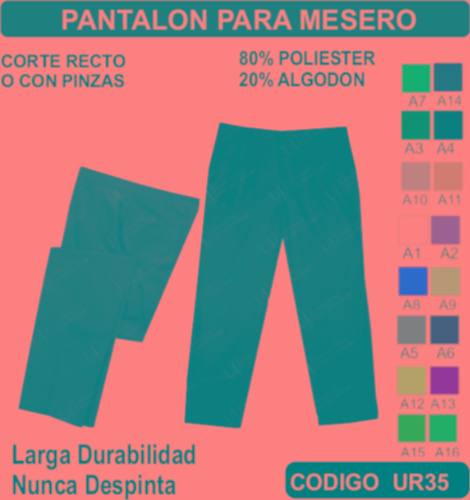El Pantalon para Mesero se fabrica en Tela de primera calidad; El Pantalon para Mesero no encoge y tiene costuras reforzadas; El Pantalon para Mesero está fabricado para uso continuo; El Pantalon para Mesero está disponible en todas las tallas; El Pantalon para Mesero se puede fabricar en cualquier color que esté disponible dentro de nuestro catálogo de telas. El Pantalon para Mesero se envía a cualquier parte de la República Mexicana. En todos los uniformes que vendemos está garantizada su inversión ya que incluye un seguro por robo o extravió. El pedido mínimo es de 15 uniformes.
