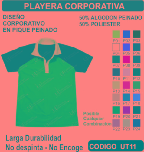 La Playera Corporativa se fabrica en Tela de primera calidad; La Playera Corporativa no encoge y tiene costuras reforzadas; La Playera Corporativa está fabricada para uso continuo; La Playera Corporativa está disponible en todas las tallas; La Playera Corporativa se puede fabricar en cualquier color que esté disponible dentro de nuestro catálogo de telas. La Playera Corporativa se envía a cualquier parte de la República Mexicana. En todos los uniformes que vendemos está garantizada su inversión ya que incluye un seguro por robo o extravió. El pedido mínimo es de 15 uniformes. Los precios incluyen: Uniforme (producto), Bordado o estampado, Planchado, Empaquetado individual, Envió a domicilio, Seguro por Robo o Extravió. El TIEMPO DE ENTREGA es de la siguiente manera: De 15 a 50 uniformes 1 semana, de 51 a 300 uniformes 2 semanas, de 301 a 1000 uniformes 3 semanas, de 1001 a 2000 uniformes 4 semanas, para pedidos mayores favor de verificar el tiempo de entrega antes de hacer su pedido. Pedidos Urgentes y tallas XXL –XXL tienen un costo adicional. El tiempo de entrega Aplica sumando el total de su pedido.