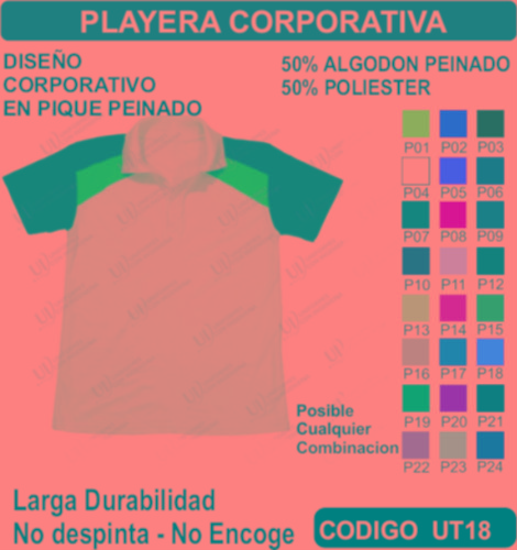 La Playera Corporativa se fabrica en Tela de primera calidad; La Playera Corporativa no encoge y tiene costuras reforzadas; La Playera Corporativa está fabricada para uso continuo; La Playera Corporativa está disponible en todas las tallas; La Playera Corporativa se puede fabricar en cualquier color que esté disponible dentro de nuestro catálogo de telas. La Playera Corporativa se envía a cualquier parte de la República Mexicana. En todos los uniformes que vendemos está garantizada su inversión ya que incluye un seguro por robo o extravió. El pedido mínimo es de 15 uniformes. Los precios incluyen: Uniforme (producto), Bordado o estampado, Planchado, Empaquetado individual, Envió a domicilio, Seguro por Robo o Extravió. El TIEMPO DE ENTREGA es de la siguiente manera: De 15 a 50 uniformes 1 semana, de 51 a 300 uniformes 2 semanas, de 301 a 1000 uniformes 3 semanas, de 1001 a 2000 uniformes 4 semanas, para pedidos mayores favor de verificar el tiempo de entrega antes de hacer su pedido. Pedidos Urgentes y tallas XXL –XXL tienen un costo adicional. El tiempo de entrega Aplica sumando el total de su pedido.