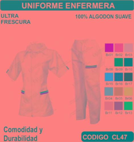 El Uniforme de Enfermera se fabrica en Tela de primera calidad; El Uniforme de Enfermera no encoge y tiene costuras reforzadas; El Uniforme de Enfermera está fabricado para uso continuo; El Uniforme de Enfermera está disponible en todas las tallas; El Uniforme de Enfermera se puede fabricar en cualquier color que esté disponible dentro de nuestro catálogo de telas. El Uniforme de Enfermera se envía a cualquier parte de la República Mexicana. En todos los uniformes que vendemos está garantizada su inversión ya que incluye un seguro por robo o extravió. El pedido mínimo es de 15 uniformes. Los precios incluyen: Uniforme (producto), Bordado o estampado, Planchado, Empaquetado individual, Envió a domicilio, Seguro por Robo o Extravió. El TIEMPO DE ENTREGA es de la siguiente manera: De 15 a 50 uniformes 1 semana, de 51 a 300 uniformes 2 semanas, de 301 a 1000 uniformes 3 semanas, de 1001 a 2000 uniformes 4 semanas, para pedidos mayores favor de verificar el tiempo de entrega antes de hacer su pedido. Pedidos Urgentes y tallas XXL –XXL tienen un costo adicional. El tiempo de entrega Aplica sumando el total de su pedido.