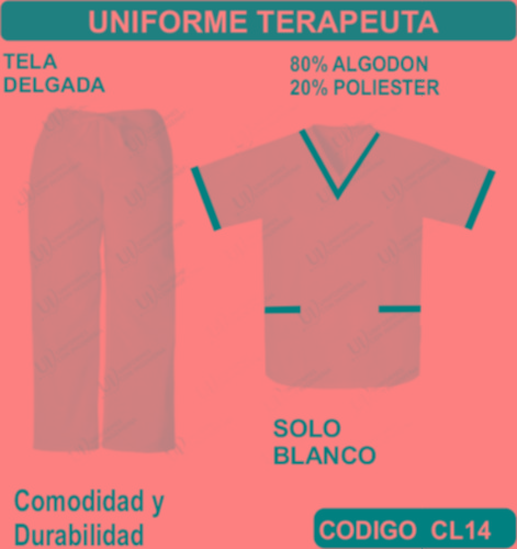 El Uniforme para Terapeuta se fabrica en Tela de primera calidad; El Uniforme para Terapeuta no encoge y tiene costuras reforzadas; El Uniforme para Terapeuta está fabricado para uso continuo; El Uniforme para Terapeuta está disponible en todas las tallas; El Uniforme para Terapeuta se puede fabricar en cualquier color que esté disponible dentro de nuestro catálogo de telas. El Uniforme para Terapeuta se envía a cualquier parte de la República Mexicana. En todos los uniformes que vendemos está garantizada su inversión ya que incluye un seguro por robo o extravió. El pedido mínimo es de 15 uniformes.
