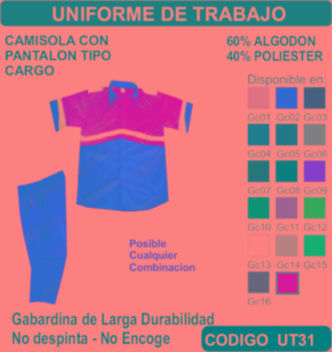 El Uniforme de Trabajo se fabrica en Tela de primera calidad; El Uniforme de Trabajo no encoge y tiene costuras reforzadas; El Uniforme de Trabajo está fabricada para uso continuo; El Uniforme de Trabajo está disponible en todas las tallas; El Uniforme de Trabajo se puede fabricar en cualquier color que esté disponible dentro de nuestro catálogo de telas. El Uniforme de Trabajo se envía a cualquier parte de la República Mexicana. En todos los uniformes que vendemos está garantizada su inversión ya que incluye un seguro por robo o extravió. El pedido mínimo es de 15 uniformes. Los precios incluyen: Uniforme (producto), Bordado o estampado, Planchado, Empaquetado individual, Envió a domicilio, Seguro por Robo o Extravió. El TIEMPO DE ENTREGA es de la siguiente manera: De 15 a 50 uniformes 1 semana, de 51 a 300 uniformes 2 semanas, de 301 a 1000 uniformes 3 semanas, de 1001 a 2000 uniformes 4 semanas, para pedidos mayores favor de verificar el tiempo de entrega antes de hacer su pedido. Pedidos Urgentes y tallas XXL –XXL tienen un costo adicional. El tiempo de entrega Aplica sumando el total de su pedido.