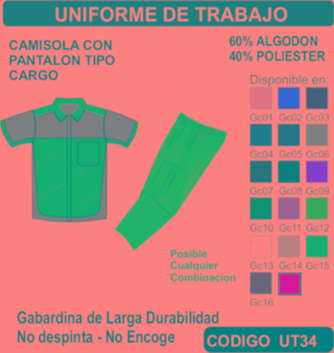 El Uniforme de Trabajo se fabrica en Tela de primera calidad; El Uniforme de Trabajo no encoge y tiene costuras reforzadas; El Uniforme de Trabajo está fabricada para uso continuo; El Uniforme de Trabajo está disponible en todas las tallas; El Uniforme de Trabajo se puede fabricar en cualquier color que esté disponible dentro de nuestro catálogo de telas. El Uniforme de Trabajo se envía a cualquier parte de la República Mexicana. En todos los uniformes que vendemos está garantizada su inversión ya que incluye un seguro por robo o extravió. El pedido mínimo es de 15 uniformes. Los precios incluyen: Uniforme (producto), Bordado o estampado, Planchado, Empaquetado individual, Envió a domicilio, Seguro por Robo o Extravió. El TIEMPO DE ENTREGA es de la siguiente manera: De 15 a 50 uniformes 1 semana, de 51 a 300 uniformes 2 semanas, de 301 a 1000 uniformes 3 semanas, de 1001 a 2000 uniformes 4 semanas, para pedidos mayores favor de verificar el tiempo de entrega antes de hacer su pedido. Pedidos Urgentes y tallas XXL –XXL tienen un costo adicional. El tiempo de entrega Aplica sumando el total de su pedido.