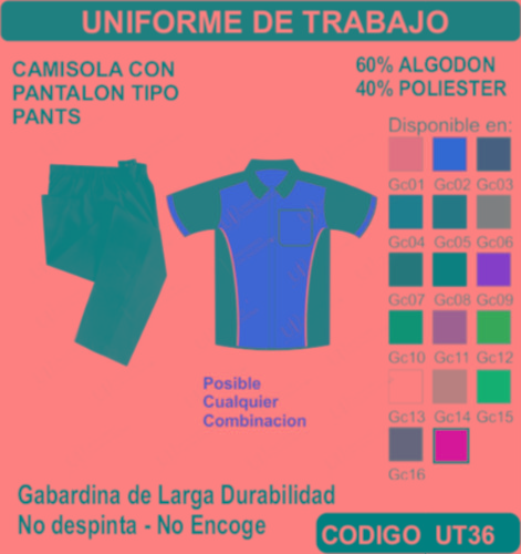 El Uniforme de Trabajo se fabrica en Tela de primera calidad; El Uniforme de Trabajo no encoge y tiene costuras reforzadas; El Uniforme de Trabajo está fabricada para uso continuo; El Uniforme de Trabajo está disponible en todas las tallas; El Uniforme de Trabajo se puede fabricar en cualquier color que esté disponible dentro de nuestro catálogo de telas. El Uniforme de Trabajo se envía a cualquier parte de la República Mexicana. En todos los uniformes que vendemos está garantizada su inversión ya que incluye un seguro por robo o extravió. El pedido mínimo es de 15 uniformes. Los precios incluyen: Uniforme (producto), Bordado o estampado, Planchado, Empaquetado individual, Envió a domicilio, Seguro por Robo o Extravió. El TIEMPO DE ENTREGA es de la siguiente manera: De 15 a 50 uniformes 1 semana, de 51 a 300 uniformes 2 semanas, de 301 a 1000 uniformes 3 semanas, de 1001 a 2000 uniformes 4 semanas, para pedidos mayores favor de verificar el tiempo de entrega antes de hacer su pedido. Pedidos Urgentes y tallas XXL –XXL tienen un costo adicional. El tiempo de entrega Aplica sumando el total de su pedido.