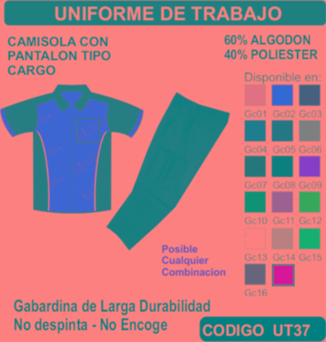 El Uniforme de Trabajo se fabrica en Tela de primera calidad; El Uniforme de Trabajo no encoge y tiene costuras reforzadas; El Uniforme de Trabajo está fabricada para uso continuo; El Uniforme de Trabajo está disponible en todas las tallas; El Uniforme de Trabajo se puede fabricar en cualquier color que esté disponible dentro de nuestro catálogo de telas. El Uniforme de Trabajo se envía a cualquier parte de la República Mexicana. En todos los uniformes que vendemos está garantizada su inversión ya que incluye un seguro por robo o extravió. El pedido mínimo es de 15 uniformes. Los precios incluyen: Uniforme (producto), Bordado o estampado, Planchado, Empaquetado individual, Envió a domicilio, Seguro por Robo o Extravió. El TIEMPO DE ENTREGA es de la siguiente manera: De 15 a 50 uniformes 1 semana, de 51 a 300 uniformes 2 semanas, de 301 a 1000 uniformes 3 semanas, de 1001 a 2000 uniformes 4 semanas, para pedidos mayores favor de verificar el tiempo de entrega antes de hacer su pedido. Pedidos Urgentes y tallas XXL –XXL tienen un costo adicional. El tiempo de entrega Aplica sumando el total de su pedido.